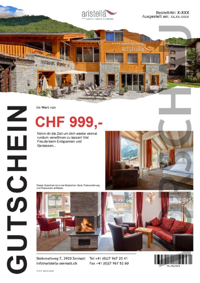 Dieser Gutschein ist im Hotel Aristella swissflair für sämtliche Dienstleistungen einlösbar. Sei es für eine oder mehrere Übernachtungen und auf Wunsch auch mit Halbpension.